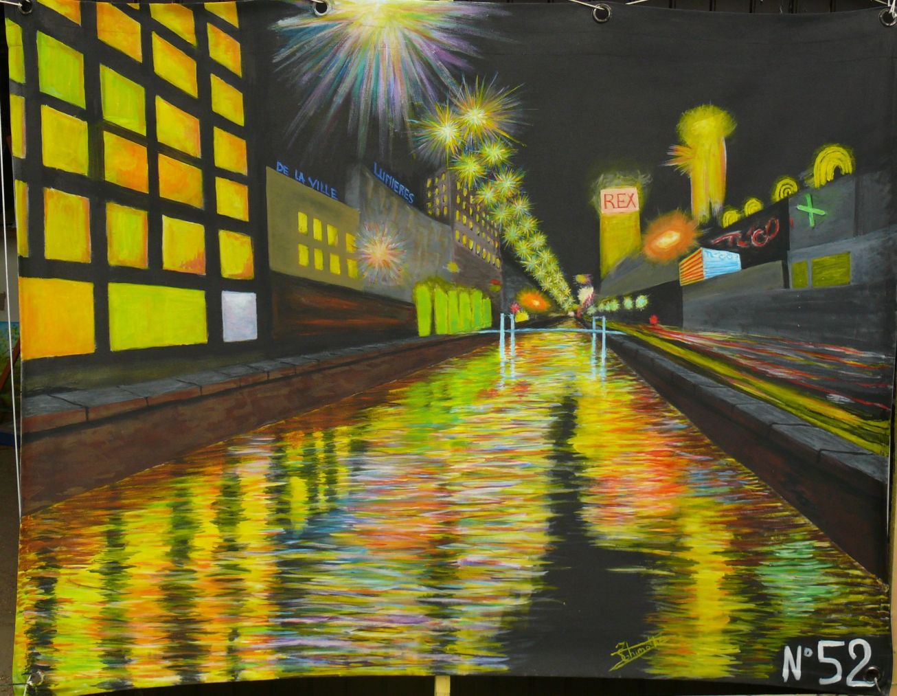 Peinture capturant les lumières nocturnes d'une ville traversée par un canal longé d’une route.