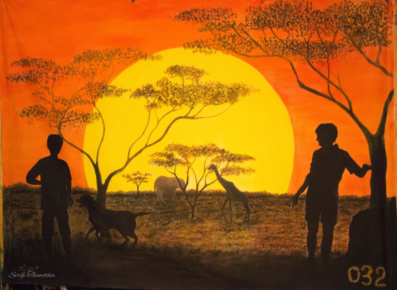 Le premier plan, où les silhouettes noires des enfants et du chien se détachent, évoque une perspective occidentale en contraste frappant avec l’immensité éclatante du soleil africain. La savane lumineuse, peuplée de silhouettes gracieuses d’animaux, semble vibrer sous une lumière intense et chaleureuse.